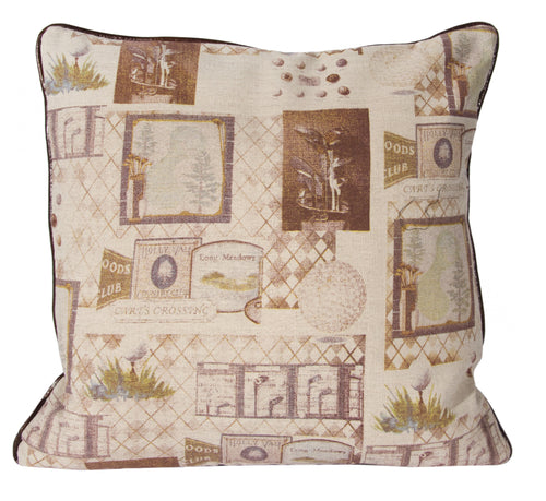 L643-GOLF 20x20" Pillow has Vintage Golf Images Eco printed on a Linen Poly Blend, Faux Leather Flat Piping and Reverse Feather Filled Insert. Part of The On the Tee Vintage Golf Collection