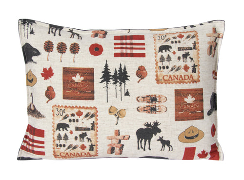 L626-STMP 14"x20" Vintage Stamp Images printed on this Pillow reverse to solid Coordinate with Feather Insert and Flanged edge part of The Vintage Canadiana Collection