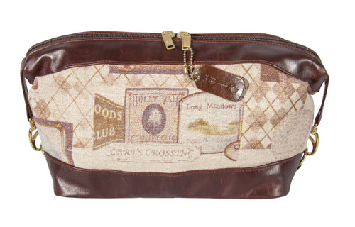 L935-GOLF Large Travel Kit Vintage Golf Images Eco printed on a Linen Poly Blend, Authentic Brown Leather Base,Trim and Handle, double Zipper. Part of The On the Tee Vintage Golf Collection and Cosmetic and Travel Collection 12"x7"x6".