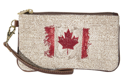 L1042-CANA Vintage Wristlet 5.5"x8"x1" Wrist strap w Snap Hook to allow snapping into a purse or belt loop, interior pocket. The Vintage Canada Flag Image Embroidered, part of the Lady Rosedale Vintage Canadiana Collection