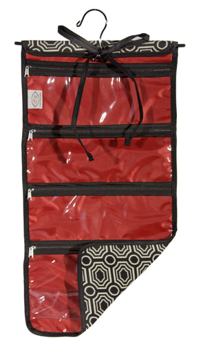 L153-1423 Hanging Cosmetic Bradstreet Ebony, Comes with Metal Hanger, multiple Zippered Pockets, bottom expandable Pocket, Rolls and ties for easy travelling and to keep everything contained. Part of the Cosmetic and Travel Collection 12"x24"