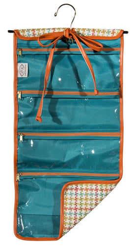 L153-3125 Hanging Cosmetic Chi Chi Coral, Comes with Metal Hanger, multiple Zippered Pockets, bottom expandable Pocket, Rolls and ties for easy travelling and to keep everything contained. Part of the Cosmetic and Travel Collection 12"x24"