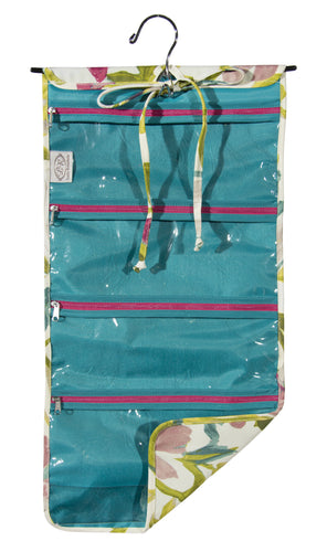 L153-3127 Hanging Cosmetic White Tea, Comes with Metal Hanger, multiple Zippered Pockets, bottom expandable Pocket, Rolls and ties for easy travelling and to keep everything contained. Part of the Cosmetic and Travel Collection 12"x24"